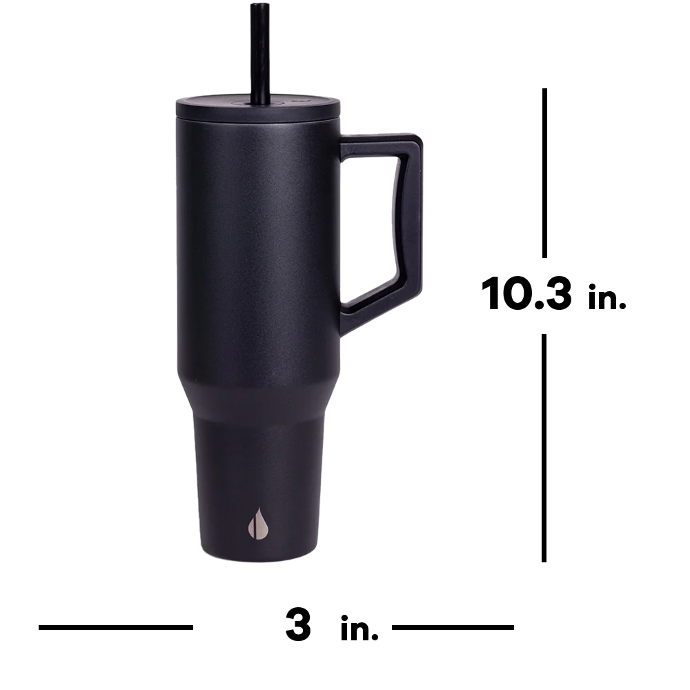 The 40 oz Commuter Tumbler from Elemental is a durable and versatile companion for your everyday routine. The triple-wall insulated stainless steel keeps beverages ice cold up to 48 hours or hot up to 12. With two straws included with each tumbler, switch between the regular straw for drinks like water and electrolytes and the wide straw for smoothies and boba tea. Comfortably grab and go with the ergonomic carry handle and cupholder friendly base.