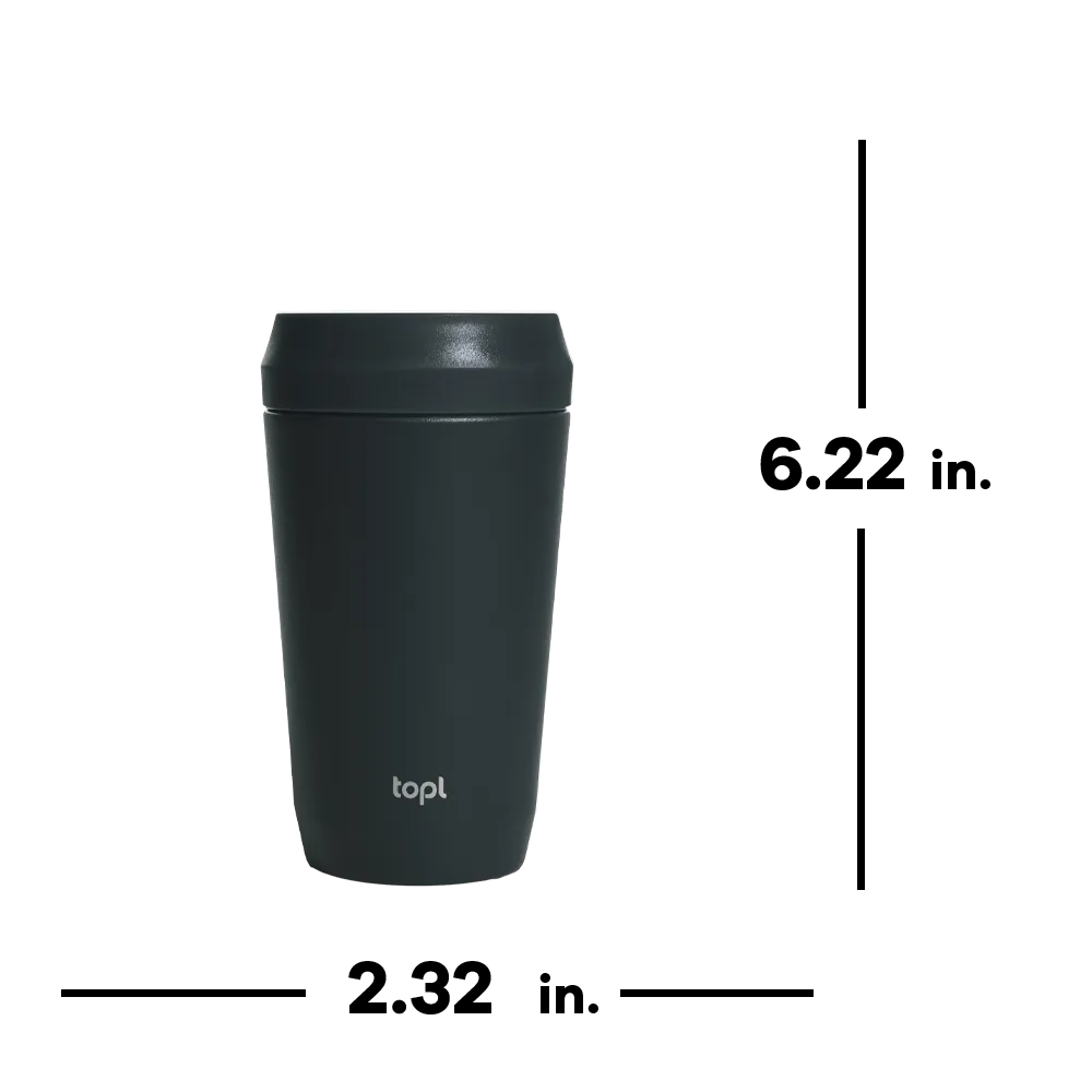 Designed to refill without having to remove the lid, the Topl Tall To Go Cup is a step above your average tumbler. Constructed with recycled stainless steel and double-wall vacuum insulation, enjoy hot coffee for up to an hour and iced beverages up to 6. The innovative 360°sip lid allows you to sip from any angle, twists fully clockwise for an airtight, leakproof seal, and creates a refill flow without lid removal. The transparent splashguard shield adds an extra layer of protection while drinking and provides a view of how much you have left. These features plus a cupholder friendly base, this cup is the ultimate, mess-free travel companion.